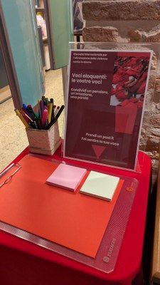 Per dare maggior forza all'iniziativa, si è scelto di accostarla a un'esposizione bibliografica dedicata al ciclo di incontri Voci eloquenti e a uno spazio libero in cui studenti, studentesse, personale accademico e cittadinanza sono invitati ad esprimere un pensiero e lasciare una traccia della propria voce.